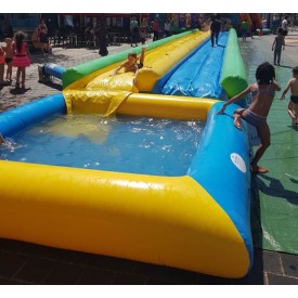 Pour une animation rafraîchissante, vous pouvez insérer un bassin gonflable à la sortie de votre ventriglisse 2 pistes. Cette option pour ventriglisse vous permet de créer des sensations aquatiques en finissant la glissade ventrale dans un bassin d'eau. Le ventriglisse aquatique avec bassin est une animation très appréciée en été car c'est un jeu très rafraîchissant. Vous pouvez utiliser le ventriglisse avec ou sans eau tout au long de l'année et choisir d'utiliser le bassin de réception aquatique ou non.